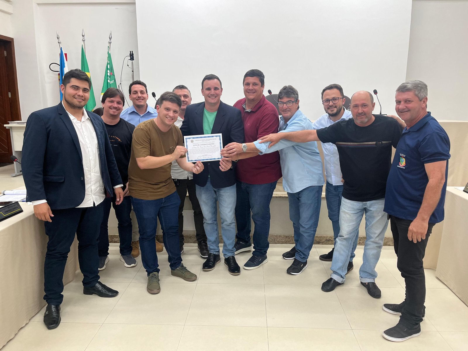 Durante a 28ª Sessão Ordinária, realizada nesta quarta-feira (06), a Câmara Municipal de Alfredo Chaves entregou Votos de Congratulações em reconhecimento ao sucesso da 50ª edição da tradicional Festa da Banana e do Leite. O prefeito Hugo Luiz e o vice-prefeito Cleber Bianchi, representando toda a equipe organizadora, receberam pessoalmente a homenagem no Plenário Brasilito Pilon.